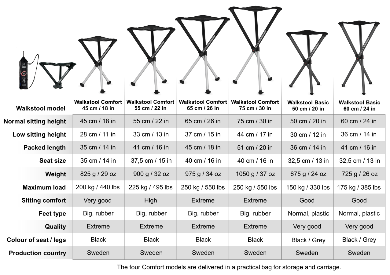 Walkstool Comfort comes as four different models with sitting heights 45, 55, 65 and 75 cm (18, 22, 26 and 30 in). The smallest model features a large and comfortable seat size, being increased on higher models.